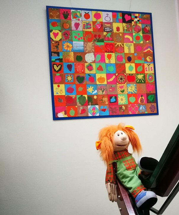 Das Bild zeigt unsere Kirchenpuppe Andrea auf der Treppe zum Keller. Über ihr hängt ein Mosaik aus Holztäfelchen. Dieses Mosaik entstand bei einem Gemeindefest anlässlich des 30. Geburtstages unserer Kirchengemeinde. Gemeindefest - Zusammenkommen, miteinander Gott loben und danken, miteinander feiern – das ist für mich ein Regenbogen, auf den es sich zu warten lohnt und von dem man jetzt schon träumen darf.