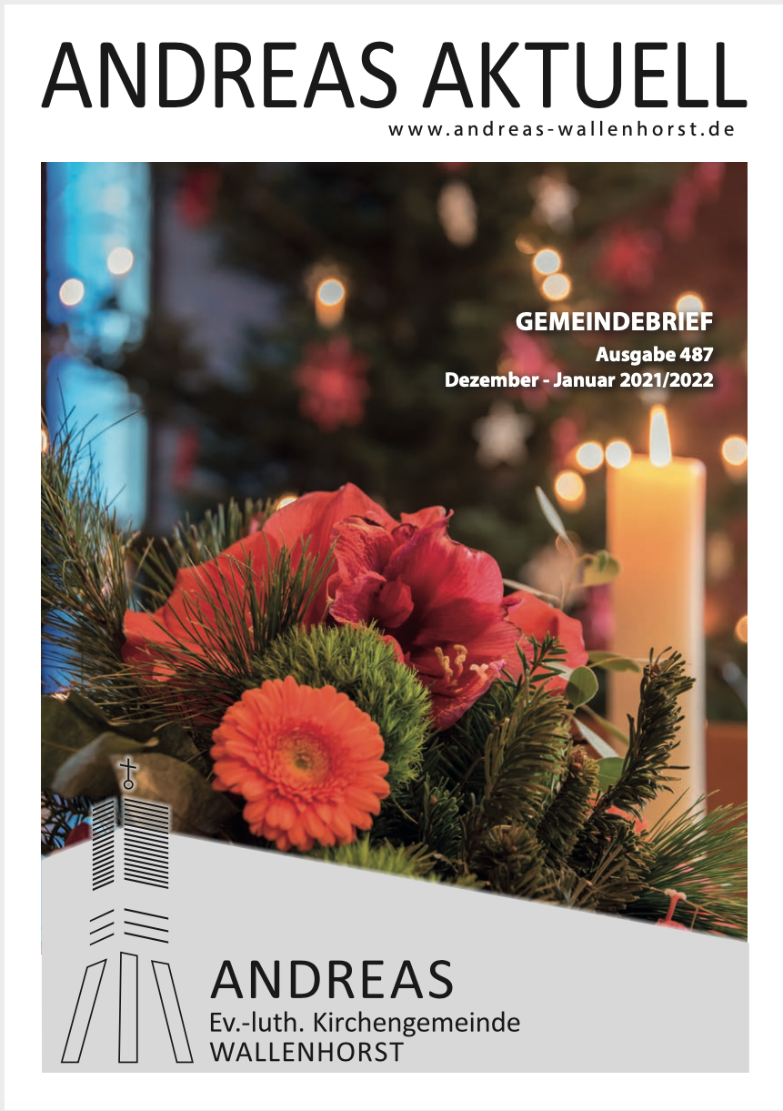 Unser Gemeindebrief Andreas Aktuell für die Monate Dezember 2021 und Januar 2022 bietet viel Adventliches und Weihnachtliches. Wir schauen voraus auf den Adventsbasar und die Heiligabend-Gottesdienste. Außerdem werfen wir einen Blick auf die neue Jahreslosung von 2022.