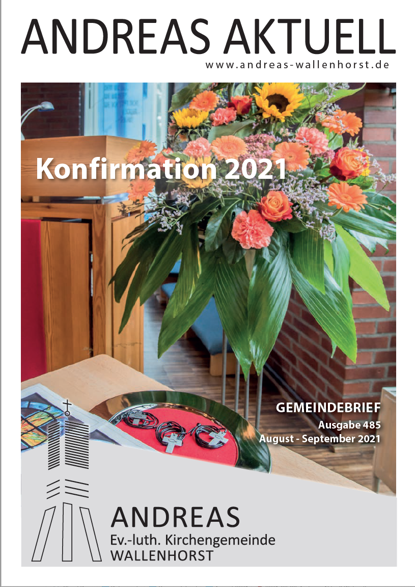 Im Gemeindebrief Andreas Aktuell für die Monate August und September 2021 geht es schwerpunktmäßig um die Konfirmation und um Aktionen für die Jugendlichen. Wir berichten vom Gottesdienst, mit dem unsere Konfirmandinnen und Konfirmanden sich vorgestellt haben, und führen auf, wie die Jugendlichen sich auf die vier Konfirmations-Gottesdienste am 18. und 19. September aufteilen. Eingeladen wird zu fünf Aktionen der Jugend-Ferien-Aktionszeit, die der Jugendkonvent sich überlegt hat.
