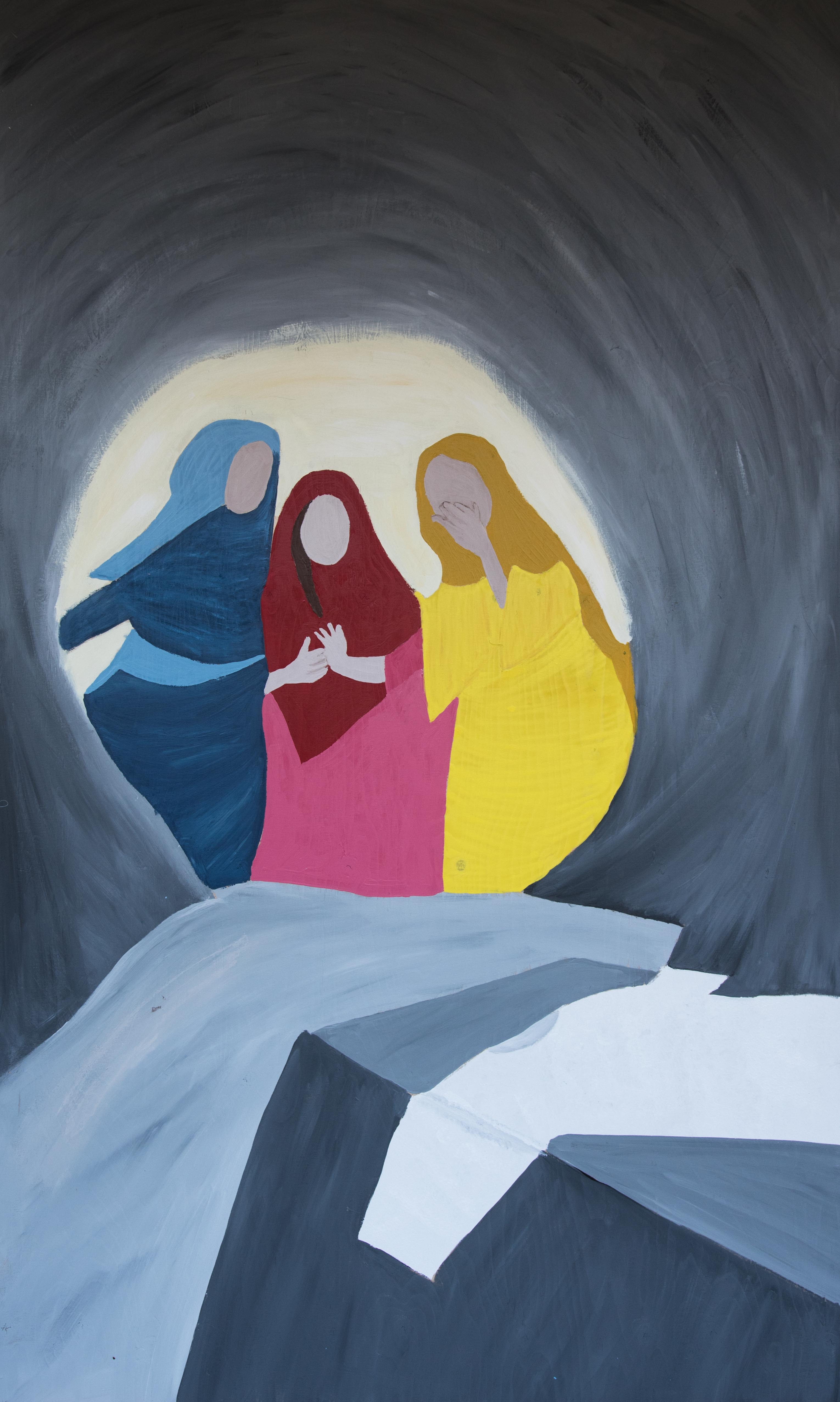 Die Jünger und Jüngerinnen, die Frauen am Brunnen, die Dorfkinder von Betphage, die Arbeiter vom Ölberg, vom Monte Oliveti, alle spielen mit, breiten ihre Kleider vor ihm her, hauen Zweige von den Bäumen und streuen sie auf den Weg.