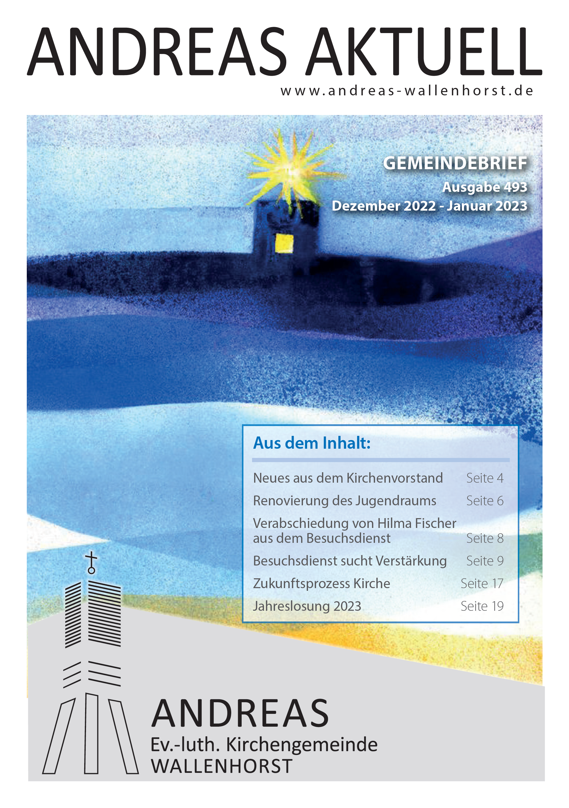 Im Weihnachts-Gemeindebrief Andreas Aktuell für die Monate Dezember 2022 und Januar 2023 finden Sie einen Bericht aus dem Kirchenvorstand, in dem es um die Folgen der Energiekrise für unsere Gemeinde geht und in dem zur Vorstellung des Konzeptes "Neuer Andreas-Kirchgarten am 5.12.2022 eingeladen wird.