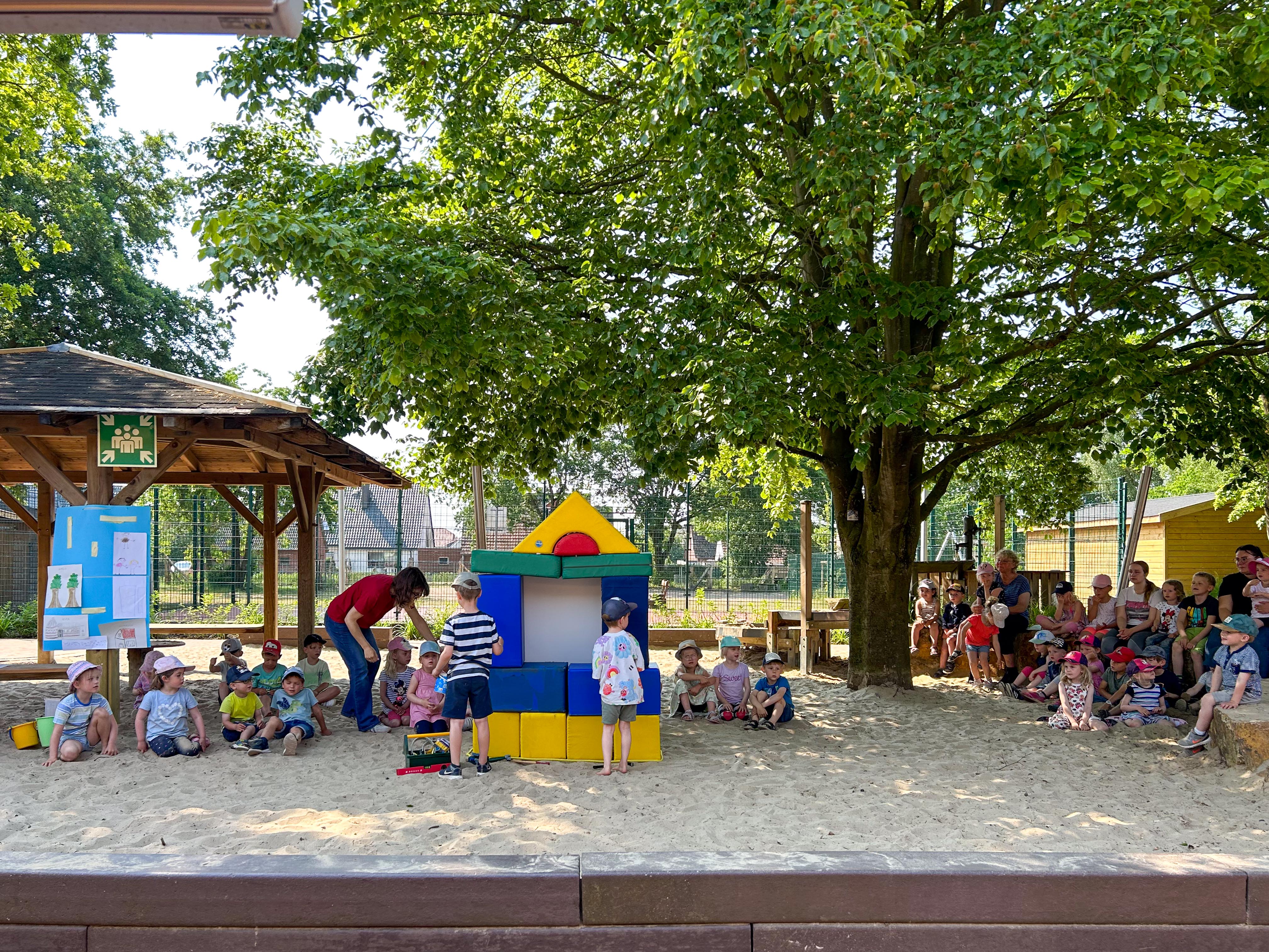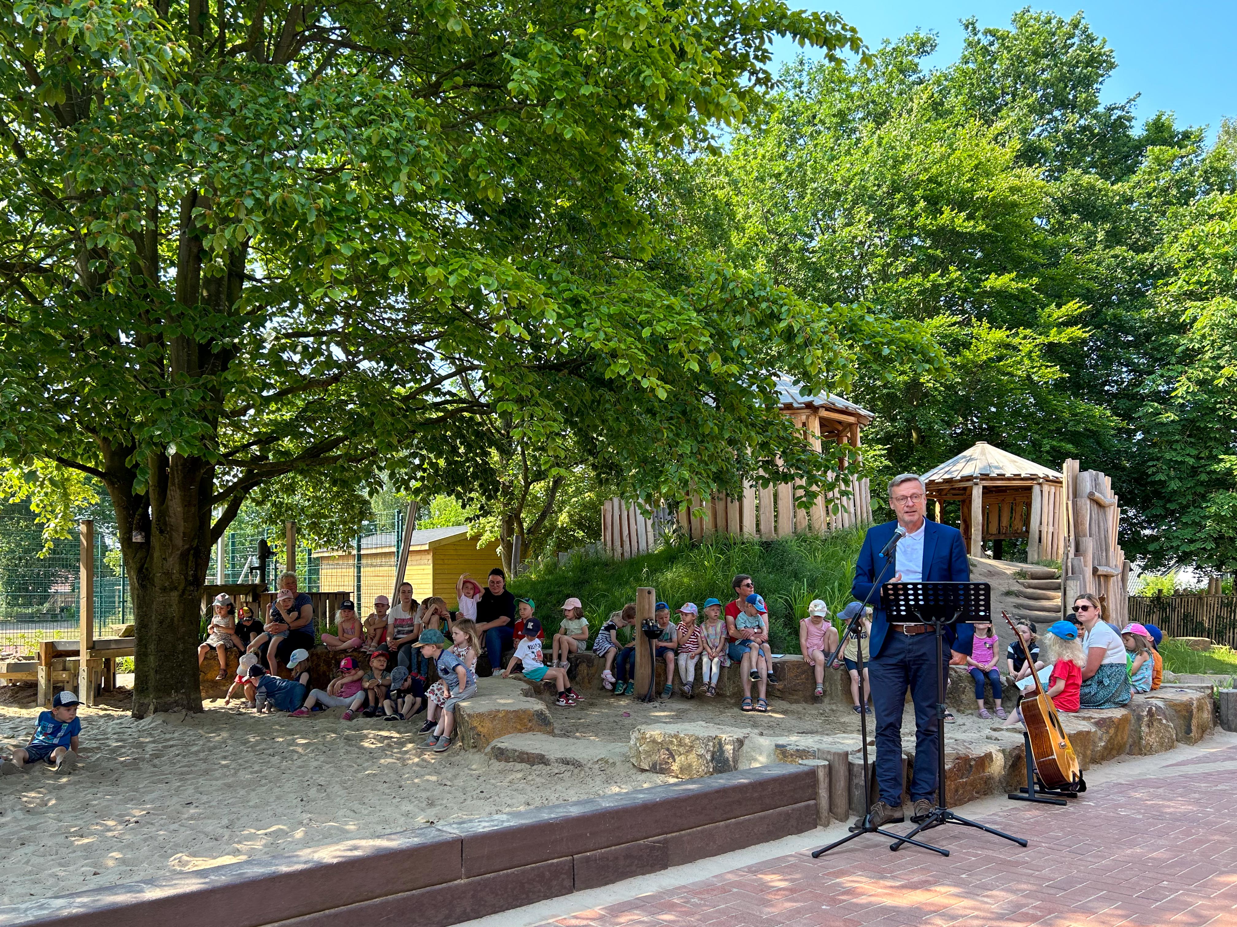 „Ich habe extra ein Kleid angezogen, weil wir heute feiern!“, sagte fröhlich ein Mädchen zu Mareike Teepe, der Leiterin unserer Andreas-KiTa, als es am Freitagmorgen, 9.6.23, in den Kindergarten kam. Und dann haben wir wirklich ein Fest gefeiert. Wir haben Gäste eingeladen, und sie sind alle gekommen: Der Bürgermeister Otto Steinkamp mit Verstärkung aus dem Rathaus, unser Superintendent Dr. Jeska und Vertreterinnen aus der Geschäftsstelle Kindertagesstätten des Ev.-luth. Kirchenkreises Osnabrück, Inga Berghaus, die Schulleiterin der benachbarten Johannisschule, die Landschaftsarchitektin Frau Müller-Dams, der Architekt Per Grunwald und natürlich auch Elternvertreter*innen und manche Gäste mehr.