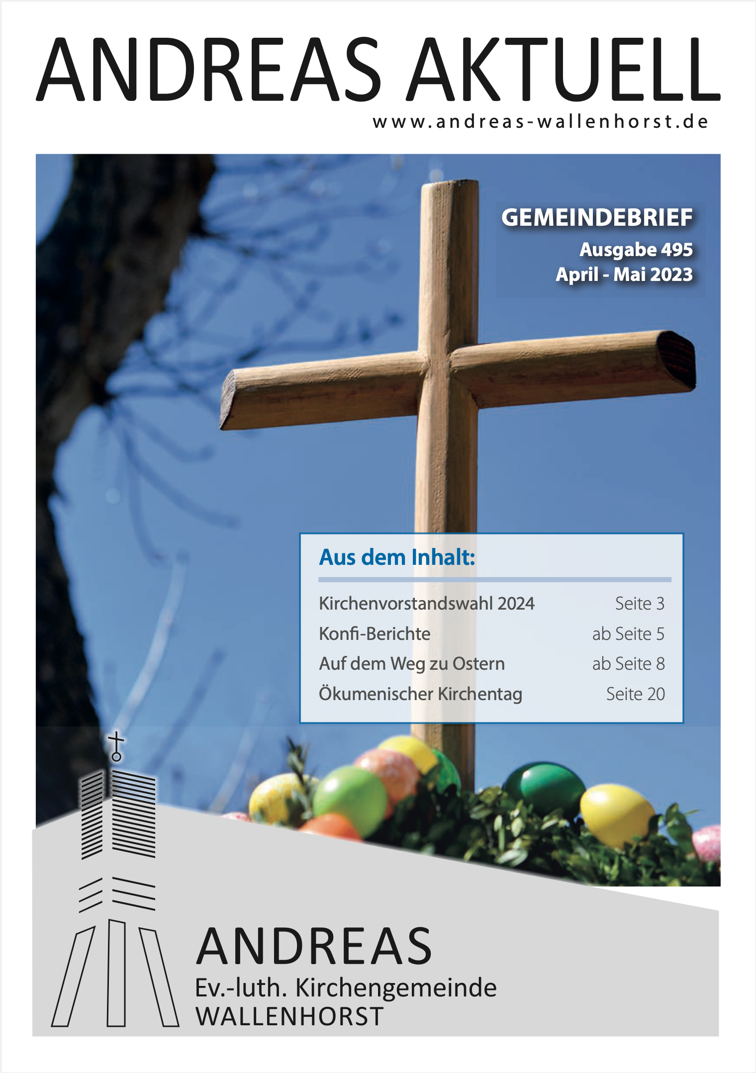 Der Schwerpunkt dieser Ausgabe liegt auf dem Osterfest. AUF DEM WEG ZU OSTERN seid ihr in die Andreaskirche eingeladen zu Gottesdiensten und Feiern: an Gründonnerstag, Karfreitag, Ostern und am Sonntag Quasimodogeniti.