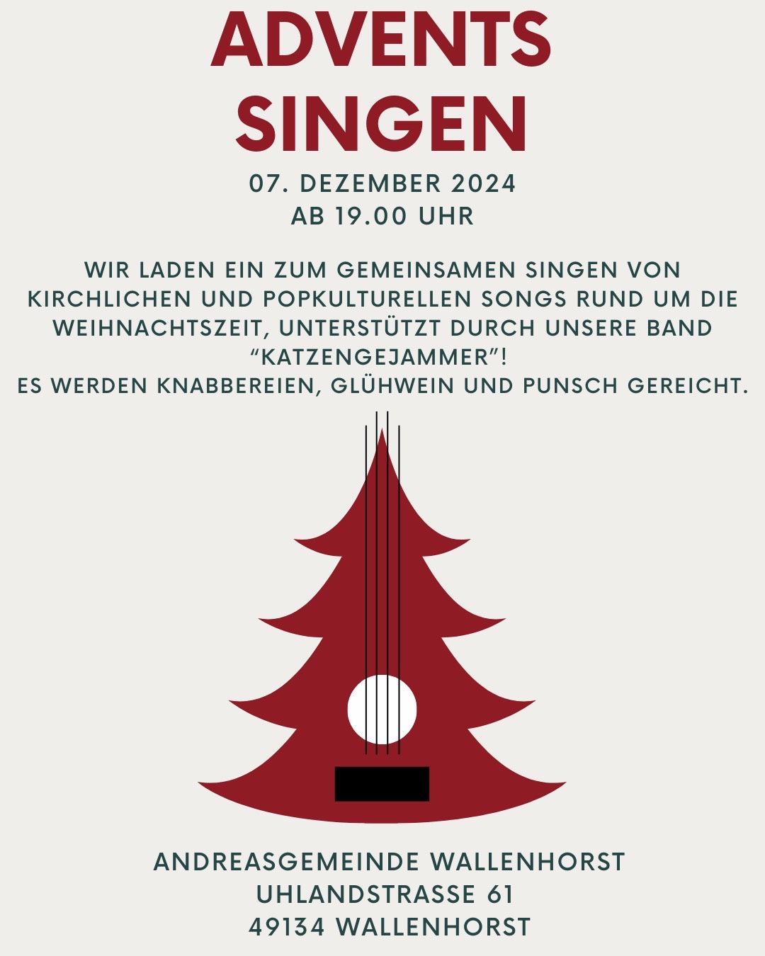 Am 7. Dezember um 19 Uhr wird in der Andreasgemeinde Hollage ein besonderes Ereignis stattfinden: Zum ersten Mallädt die Gemeinde zum gemeinsamen Adventssingen ein, begleitet vom Katzengejammer. Bei Glühwein, alkoholfreiem Punsch und festlicher Musik möchten wirzusammen die Adventszeit einläuten.