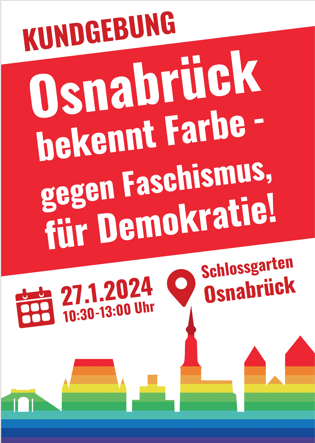 Darum bitte ich euch alle, euch an der an der Kundgebung und den weiteren Demonstrationen am 27. Januar um 10.30 Uhr im Schlossgarten in Osnabrück zu beteiligen. Wer mag, kann bereits um 9.30 Uhr zum ökumenischen Gedenkgottesdienst für die Opfer der nationalsozialistischen Gewaltherrschaft in die St. Marienkirche kommen, der von der Heilpädagogischen Hilfe Osnabrück mitgestaltet wird. Übrigens gehören sowohl der Ev.-luth. Kirchenkreis Osnabrück und die Diakonie Osnabrück zu den Mitorganisatoren der Kundgebung im Schlossgarten. Hier findet ihr einen Aufruf von Superintendent Dr. Jeska: 2024-01-23_Aufruf_Kundgebung_2701.pdf