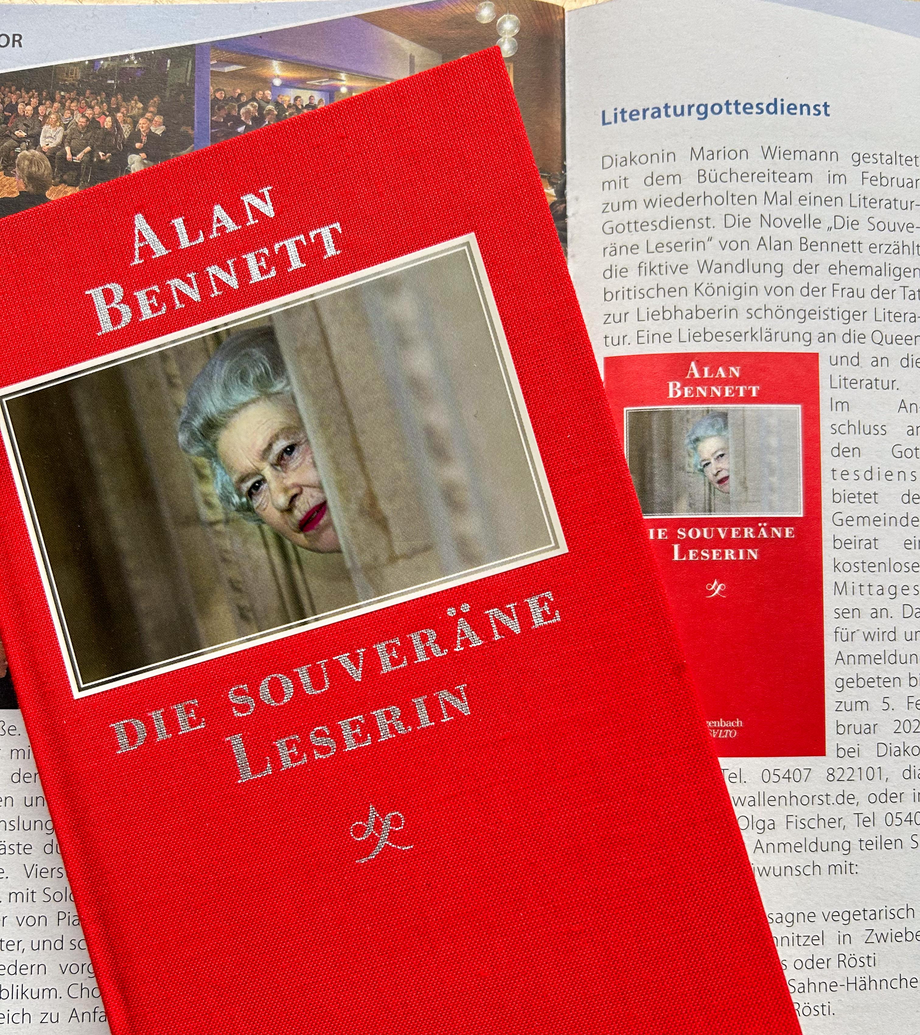 Diakonin Marion Wiemann gestaltet mit dem Büchereiteam im Februar zum wiederholten Mal einen Literatur-Gottesdienst. Die Novelle „Die Souveräne Leserin“ von Alan Bennett erzählt die fiktive Wandlung der ehemaligen britischen Königin von der Frau der Tat zur Liebhaberin schöngeistiger Literatur. Eine Liebeserklärung an die Queen und an die Literatur.