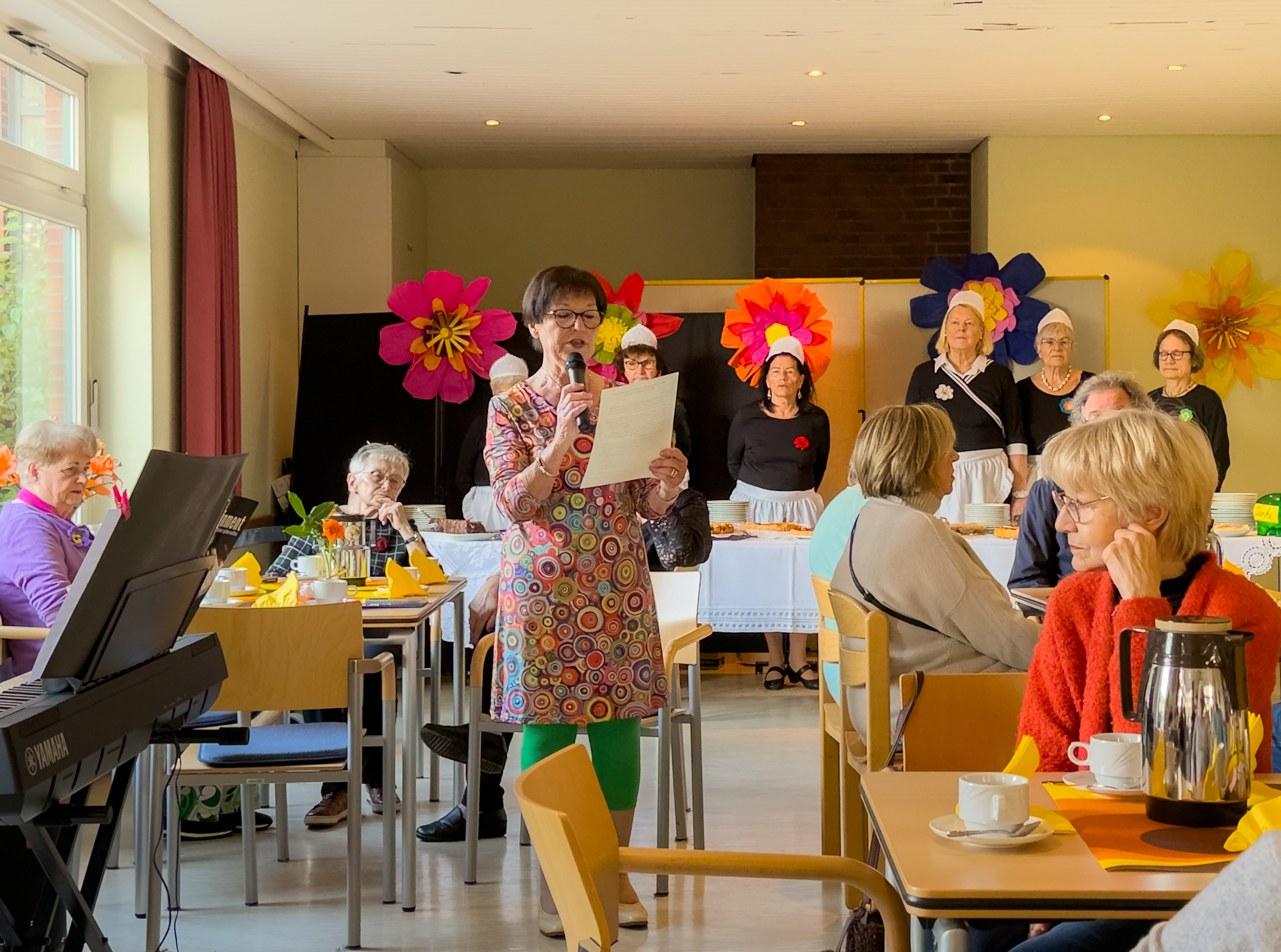 Beim Betreten des Raumes fielen sofort die stilecht in den warmen Farben der 70er gedeckten Kaffeetische, die bunte Blumendekoration an den Wänden und auf den Tischen sowie das wundervolle, reichlich bestückte Kuchenbuffet mit den für diesen Anlass herausgeputzten „Servierdamen“ des Frauenkreises auf (v. l.: Eva Kroop, Lydia v. d. Benken, Margret Claushallmann, Leiterin Angelika Bayer, Heide Beuing, Gerlinde Schröder, Birgitta Gärtner). Alle Kuchen und Torten, die man auch in den 70ern auftischte, waren von den Frauen der Gruppe selbst gebacken. Pünktlich um 15.00 Uhr begrüßte Angelika Bayer die zahlreichen Gäste jeden Alters im sehr gut gefüllten „Café“. Man sah es den Gesichtern an: Alle waren gespannt auf das, was sie erwartete. Endlich konnte das Kuchenbuffet, nostalgisch bestückt mit weißen mit Häkelspitze versehenen Tischdecken, gestürmt werden. Die Gäste unterhielten sich währenddessen prächtig, was man auch an der Lautstärke festmachen konnte.