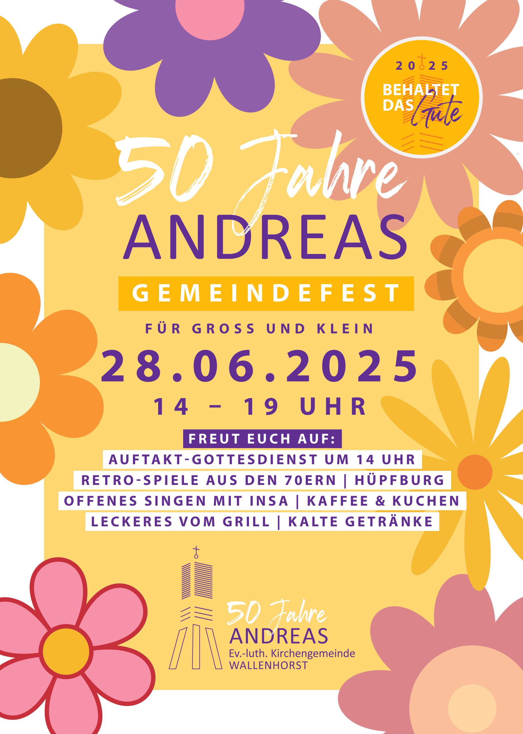Am Samstag, dem 28. Juni, startet unter dem Motto „Behaltet das Gute!“ das Gemeindefest zum 50. Jubiläum der Andreasgemeinde mit einem Gottesdienst für die ganze Gemeinde. Bei schönem Wetter feiern wir hoffentlich draußen im Garten hinter der Kirche.