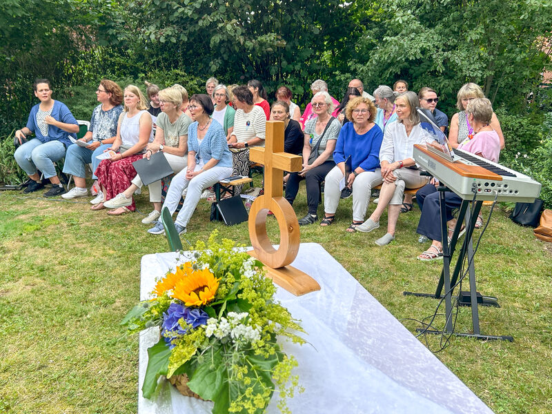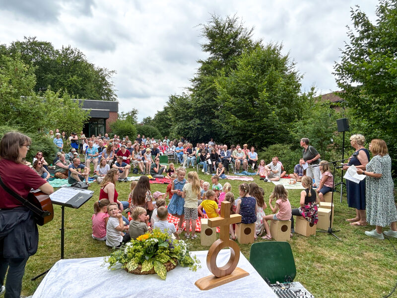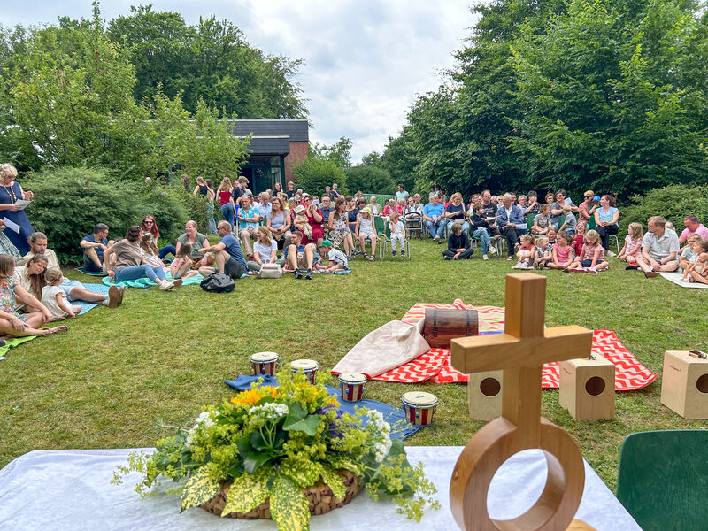 Die Sonne lachte, der Wind raschelte in den Bäumen, die Stuhlreihen füllten sich zügig. Vor dem aufgebauten Altar wurden Picknickdecken ausgelegt, auf denen die Kinder der Andreas-Kita Platz fanden. Es war eine sehr schöne Stimmung vor besonderer Kulisse im Gemeindegarten.