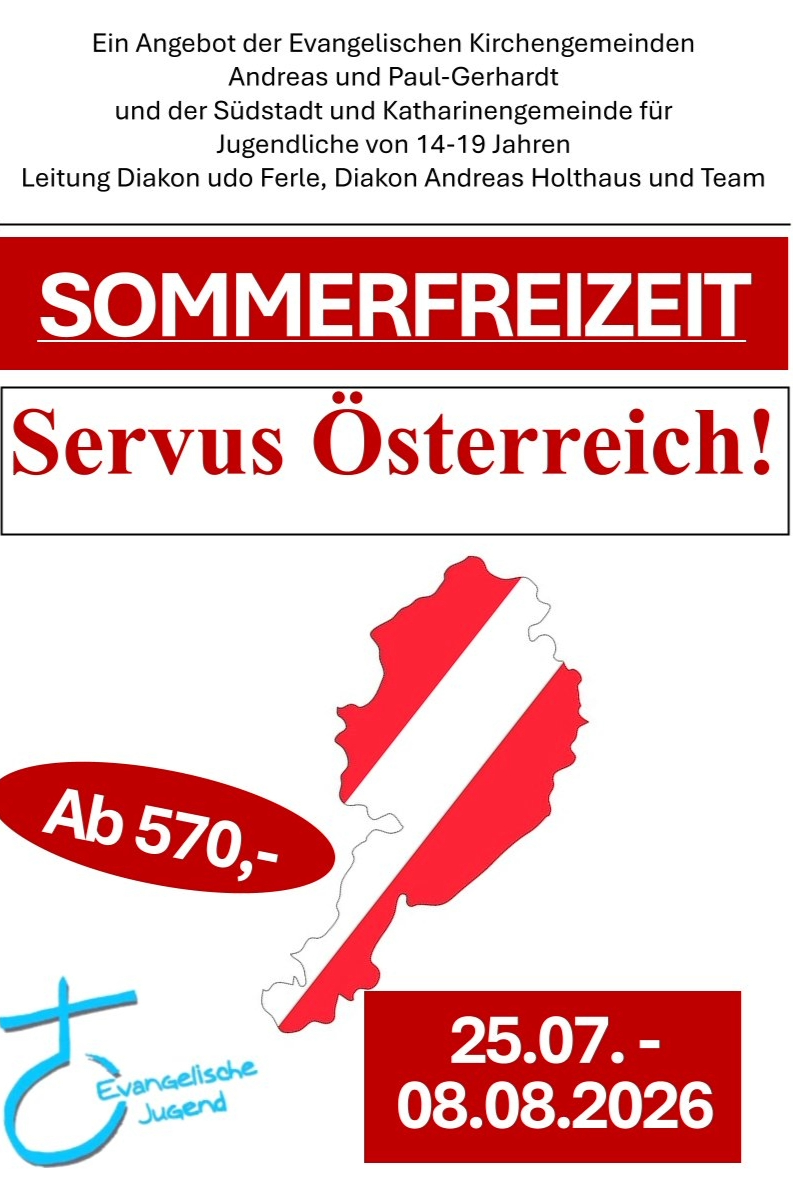 Vom 25.07. bis zum 08.08.2026 geht es los - "Servus Österreich” heißt es dann bei unserer Jugendfreizeit 2026. Die Fahrt führt diesmal ins schöne Tirol, einer Region mitten in unserem Nachbarland Österreich. Unser Haus namens Jugendhof Glatzham liegt in der Nähe der Orte Wörgel und Breitenbach.