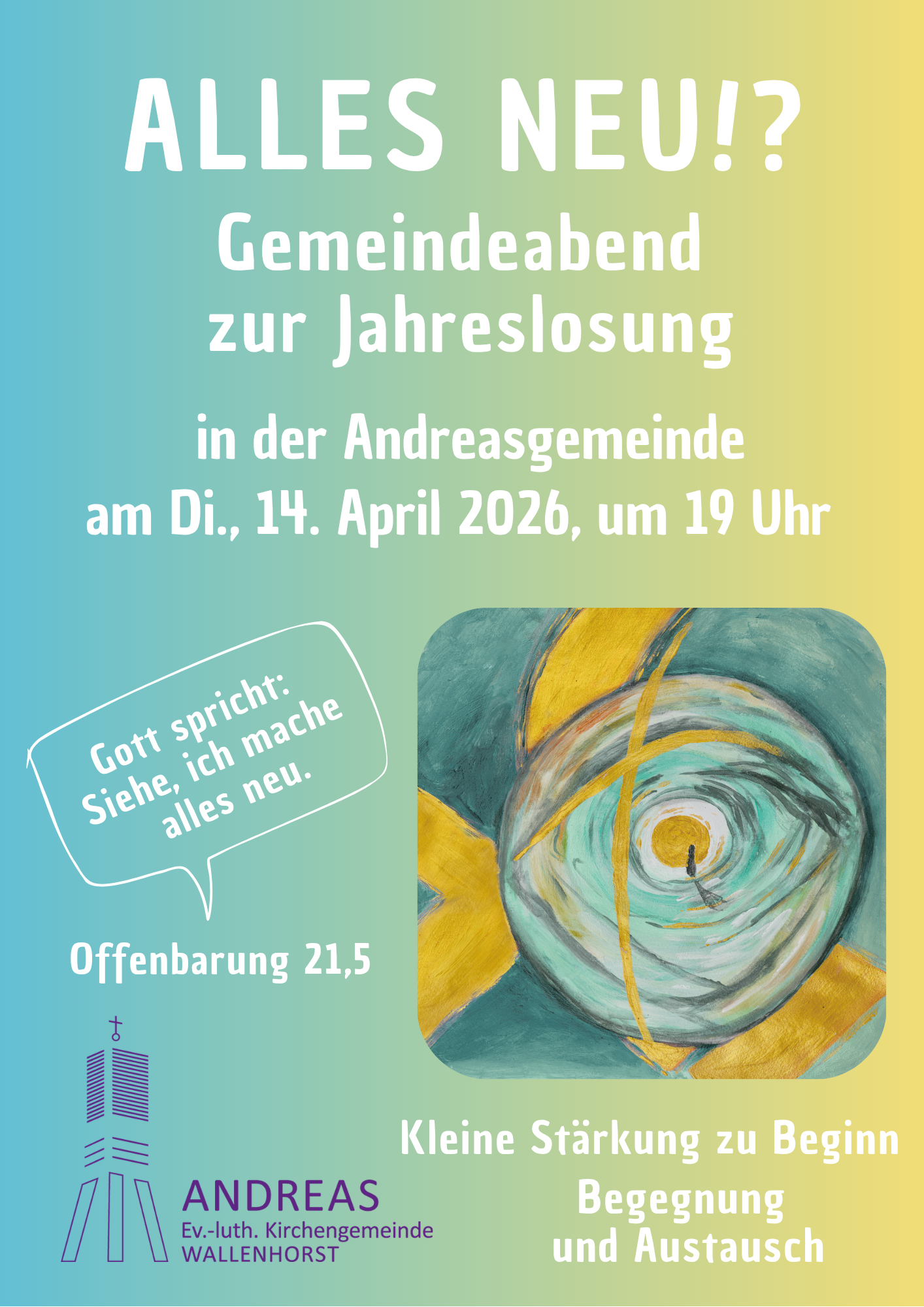 - Am Dienstag, 14. April, laden wir Sie herzlich ein, sich um 19.00 Uhr in gemütlicher Runde in der Andreaskirche zu treffen. Wir wollen gemeinsam über die diesjährige Jahreslosung „Siehe, ich mache alles neu“ ins Gespräch kommen und entdecken, was dieser Satz für uns heute bedeuten kann.