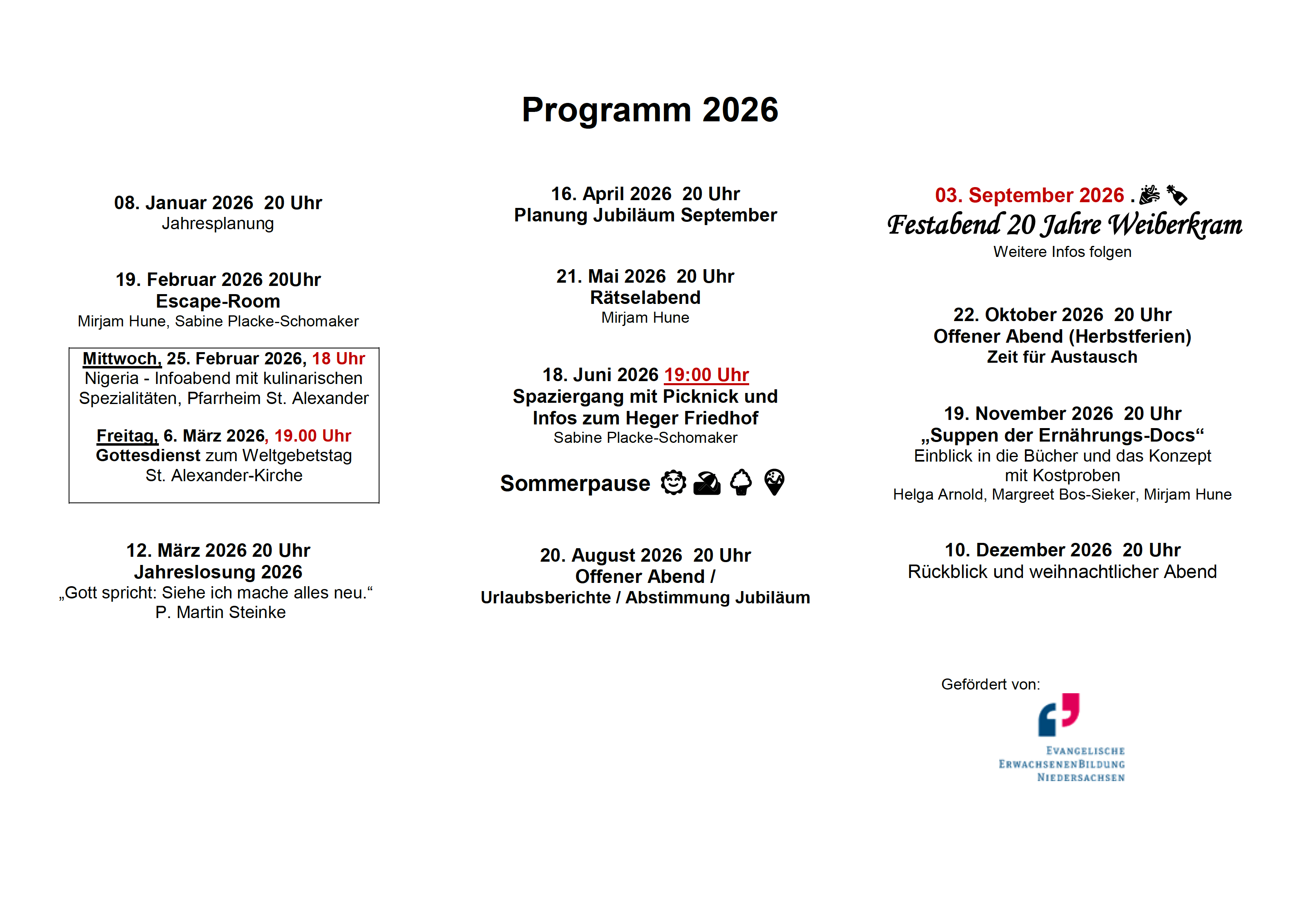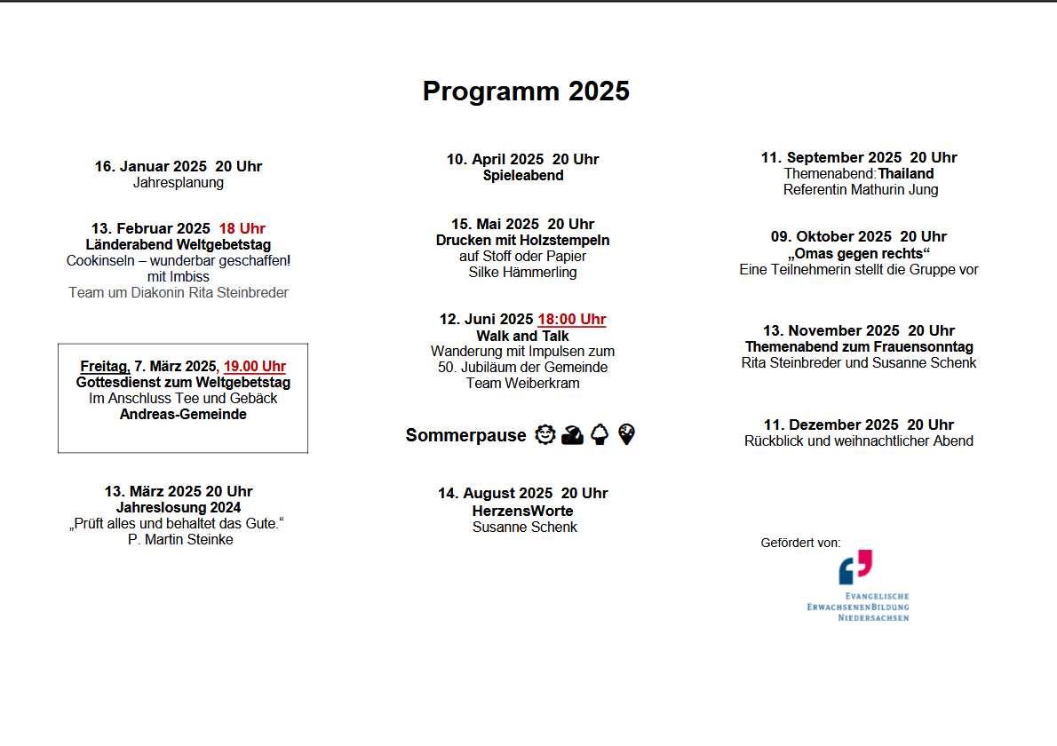 Wenn ihr Euch zu jung fühlt für die Seniorengruppe und zu alt für die Jugendgruppe, dann seid Ihr herzlich willkommen zu unserer konfessions-unabhängigen Frauengruppe „Weiberkram“. Wir wollen gemeinsam ins Gespräch kommen, Verschiedenes unternehmen und etwas für Körper, Geist und Seele tun.